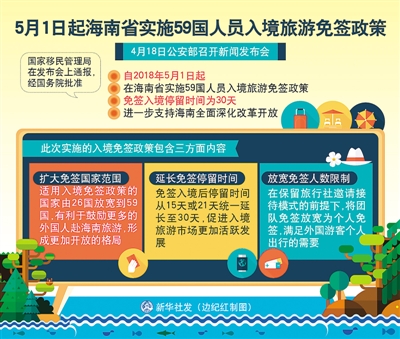 “擴(kuò)大免簽國范圍;延長免簽停留時間;放寬免簽人數(shù)限制?!?月18日,公安部在京召開新聞發(fā)布會,國家移民管理局在發(fā)布會上通報:經(jīng)國務(wù)院批準(zhǔn),自2018年5月1日起,在海南省實施59國人員入境旅游免簽政策,進(jìn)一步支持海南全面深化改革開放。