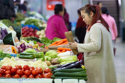 4月11日,南京市民在一家農(nóng)貿(mào)市場(chǎng)購(gòu)買蔬菜。新華社發(fā)(蘇陽(yáng)攝)