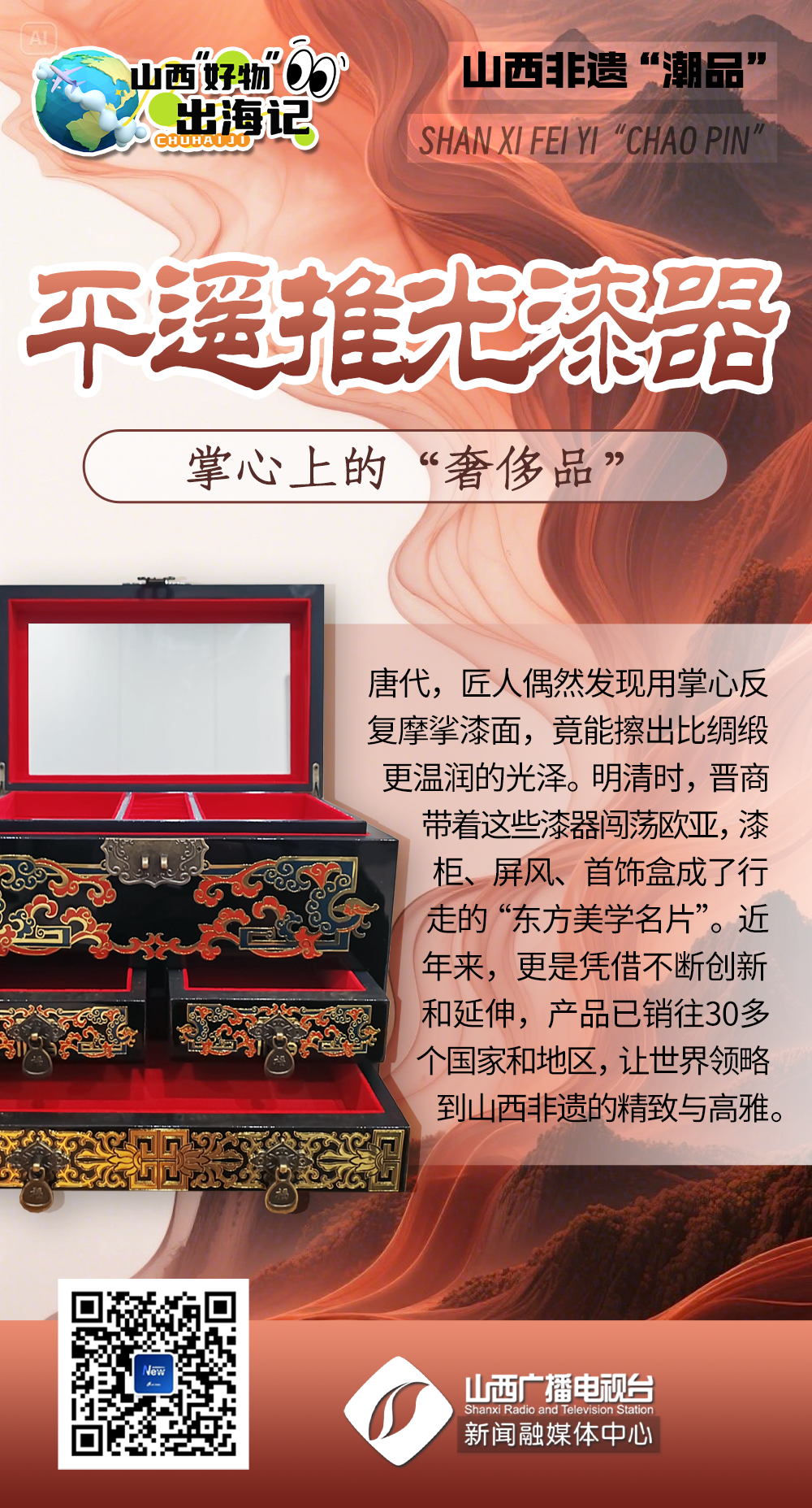 《山西“好物”出海記》特別策劃持續(xù)聚焦三晉“好物”出海征程!本期帶你直擊《山西非遺“潮品”成海外市場(chǎng)“香餑餑”》,看三晉大地的非遺瑰寶搭乘時(shí)代東風(fēng),穿越山海,驚艷世界,在“一帶一路”的畫卷上書寫文明對(duì)話新篇章。