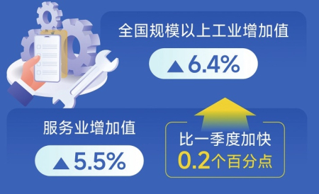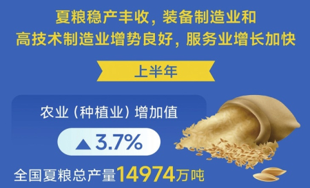 夏糧穩(wěn)產(chǎn)豐收,裝備制造業(yè)和高技術(shù)制造業(yè)增勢良好,服務業(yè)增長加快。上半年,農(nóng)業(yè)(種植業(yè))增加值同比增長3.7%,全國夏糧總產(chǎn)量14974萬噸;全國規(guī)模以上工業(yè)增加值同比增長6.4%,其中裝備制造業(yè)增加值同比增長10.2%,高技術(shù)制造業(yè)增加值增長9.5%,增速分別快于全部規(guī)模以上工業(yè)3.8和3.1個百分點;服務業(yè)增加值同比增長5.5%,比一季度加快0.2個百分點。
