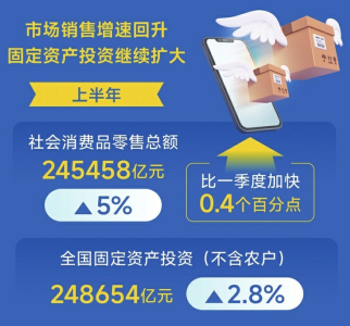 市場銷售增速回升,固定資產(chǎn)投資繼續(xù)擴大。上半年,社會消費品零售總額245458億元,同比增長5%,比一季度加快0.4個百分點。全國固定資產(chǎn)投資(不含農(nóng)戶)248654億元,同比增長2.8%;扣除房地產(chǎn)開發(fā)投資,全國固定資產(chǎn)投資增長6.6%。