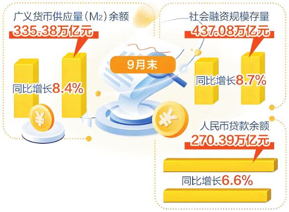 9月末,M2余額335.38萬億元,同比增長8.4%,在上年同期高基數(shù)背景下,仍保持較高增速;社會融資規(guī)模存量437.08萬億元,同比增長8.7%,比上年同期高0.7個百分點(diǎn);前三季度,社會融資規(guī)模增量累計為30.09萬億元,同比多增4.42萬億元。