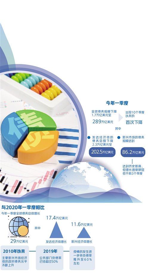 日前,國(guó)際金融協(xié)會(huì)發(fā)布了最新的全球債務(wù)監(jiān)測(cè)報(bào)告。好消息是全球債務(wù)規(guī)模在2021年一季度出現(xiàn)10個(gè)季度以來(lái)的首次下降;壞消息是全球債務(wù)規(guī)模體量巨大、償債能力不均衡等問題依然存在。