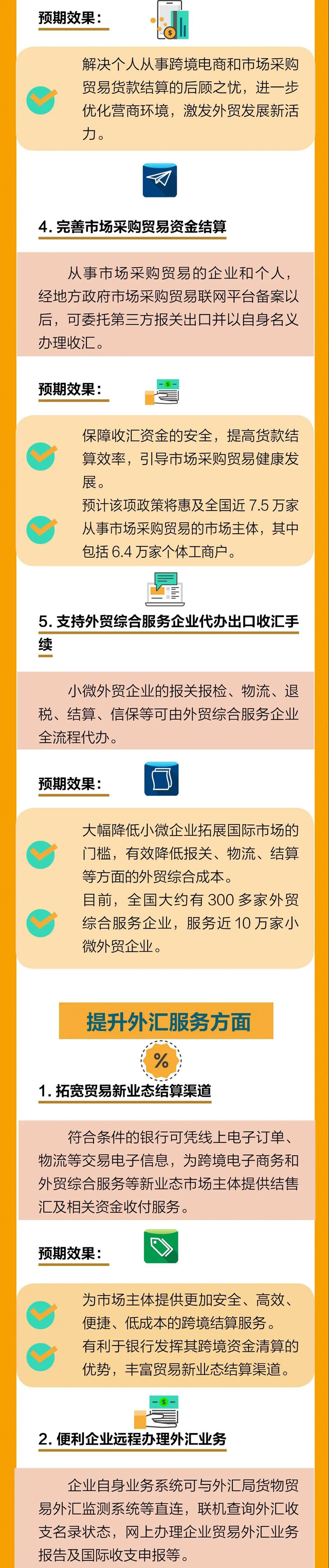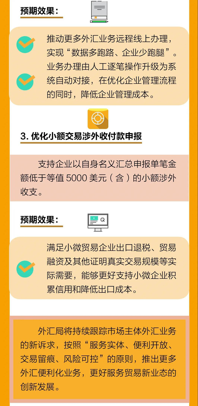 記者梳理發(fā)現,《通知》包括9方面內容,聚焦解決貿易新業(yè)態(tài)“小額、高頻、電子化”交易中結算不便捷問題。政策設計上,遵循“鼓勵創(chuàng)新、包容審慎”原則,積極適應貿易新業(yè)態(tài)發(fā)展的實際需要。按照“服務實體、便利開放、交易留痕、風險可控”要求,放寬貿易新業(yè)態(tài)外匯政策,優(yōu)化外匯服務,便利相關外匯業(yè)務辦理,實施“交易越合規(guī)、匯兌越便利”的信用約束和分類管理。