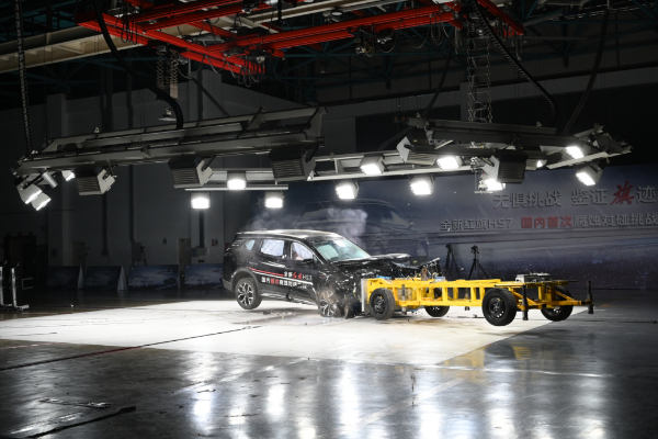 本次碰撞試驗(yàn),在中國汽車技術(shù)研究中心實(shí)車碰撞實(shí)驗(yàn)室進(jìn)行。經(jīng)過鹽水噴淋試驗(yàn)后的全新紅旗HS7與試驗(yàn)臺(tái)車,以100km/h的相對(duì)速度,進(jìn)行車輛正面副駕駛側(cè)50%對(duì)碰。