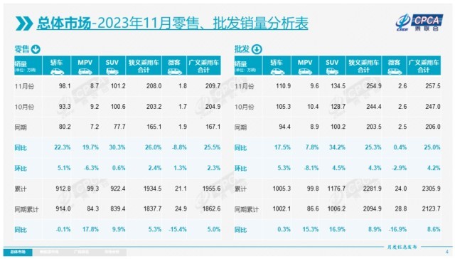 乘聯(lián)會(huì)指出,今年11月車市零售環(huán)比小幅走強(qiáng),形成冬季時(shí)間升溫的持續(xù)走強(qiáng)態(tài)勢(shì),這也是近幾年的常見走勢(shì),原因是新能源車的增長(zhǎng)動(dòng)力驅(qū)動(dòng)環(huán)比走強(qiáng)疊加小批量燃油車國(guó)六A車型清庫。相較于歷年的年末促銷力度企穩(wěn)收縮的特征,今年11月車市促銷持續(xù)增大,燃油車和新能源車促銷均環(huán)比增大,針對(duì)性的增換購促銷和地方補(bǔ)貼,購車消費(fèi)需求有所釋放。 乘聯(lián)會(huì)分析稱,國(guó)家層面針對(duì)汽車行業(yè)的指引政策頻出,旨在進(jìn)一步穩(wěn)定和擴(kuò)大汽車消費(fèi)。商務(wù)部推動(dòng)“百城聯(lián)動(dòng)”汽車節(jié)和“千縣萬鎮(zhèn)”新能源汽車消費(fèi)季活動(dòng)效果顯現(xiàn),多地陸續(xù)發(fā)布新的促消費(fèi)政策,與企業(yè)促銷合力對(duì)年底車市構(gòu)成穩(wěn)定支撐。持續(xù)的降價(jià)浪潮使得終端消費(fèi)者觀望情緒加重,終端促銷邊際效益遞減,“雙11”的市場(chǎng)火爆程度偏弱。 出口方面,今年總體汽車出口延續(xù)去年年末強(qiáng)勢(shì)增長(zhǎng)特征。11月海關(guān)汽車出口52.4萬輛,同比增長(zhǎng)41.6%;1-11月海關(guān)汽車出口476.2萬輛,同比增長(zhǎng)59.8%,出口金額927億美元增70.9%。乘聯(lián)會(huì)統(tǒng)計(jì)口徑下的11月乘用車出口(含整車與CKD)37.8萬輛,同比增長(zhǎng)50%,環(huán)比下降3%。1-11月乘用車出口345萬輛,同比增長(zhǎng)64%。11月新能源車占出口總量的23.5%。隨著出口運(yùn)力的提升,11月自主品牌出口達(dá)到33.3萬輛,同比增長(zhǎng)75%,環(huán)比增長(zhǎng)5%;合資與豪華品牌出口4.5萬輛,同比下降37%。 新能源方面,11月新能源乘用車生產(chǎn)達(dá)到98.9萬輛,同比增長(zhǎng)37.3%,環(huán)比增長(zhǎng)7.2%。今年以來累計(jì)生產(chǎn)783.5萬輛,同比增長(zhǎng)32.4%。 11月新能源乘用車批發(fā)銷量達(dá)到96.2萬輛,同比增長(zhǎng)31.5%,環(huán)比增長(zhǎng)8.2%;今年以來累計(jì)批發(fā)777.7萬輛,同比增長(zhǎng)35.2%。11月新能源車市場(chǎng)零售84.1萬輛,同比增長(zhǎng)39.8%,環(huán)比增長(zhǎng)8.9%;今年以來累計(jì)零售680.9萬輛,同比增長(zhǎng)35.2%。 對(duì)于后期車市,乘聯(lián)會(huì)表示,今年12月是小月,元旦休假有兩天在12月。12月有21個(gè)工作日,相對(duì)2022年12月的22個(gè)工作日少一天,加之年末最后兩天休假,預(yù)計(jì)今年部分年銷量將結(jié)轉(zhuǎn)到明年,這必將對(duì)2024年的開門紅有很好的支撐效果,也有利于明年經(jīng)濟(jì)增長(zhǎng)。 新能源車方面,乘聯(lián)會(huì)認(rèn)為,2024年新能源車的市場(chǎng)增長(zhǎng)預(yù)計(jì)相對(duì)樂觀:新能源乘用車批發(fā)預(yù)計(jì)達(dá)到1100萬輛,凈增量230萬輛,同比增長(zhǎng)22%,滲透率達(dá)到40%,新能源乘用車保持較強(qiáng)增長(zhǎng)勢(shì)頭。(中新經(jīng)緯APP) (責(zé)任編輯:蔡文斌) |