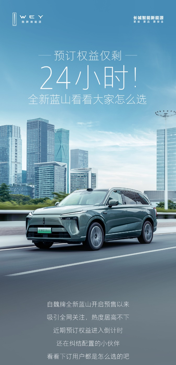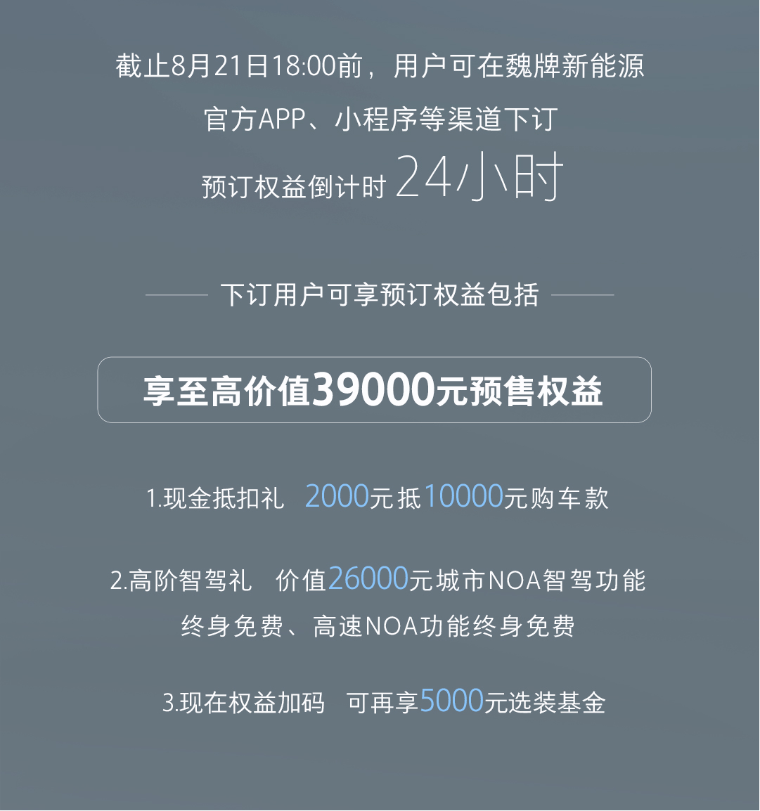 8月21日魏牌全新藍山上市,預(yù)訂權(quán)益正式進入倒計時,截至8月21日18:00前,可以在魏牌新能源官方APP、小程序等渠道下訂。下訂用戶可享至高價值39000元預(yù)售權(quán)益,含現(xiàn)金抵扣禮(2000元抵10000元購車款),高階智駕禮(價值26000元城市NOA智駕功能終身免費,高速NOA功能終身免費),現(xiàn)在還有現(xiàn)時權(quán)益加碼,可再享5000元選裝基金。還在糾結(jié)配置的用戶,抓緊下訂吧。