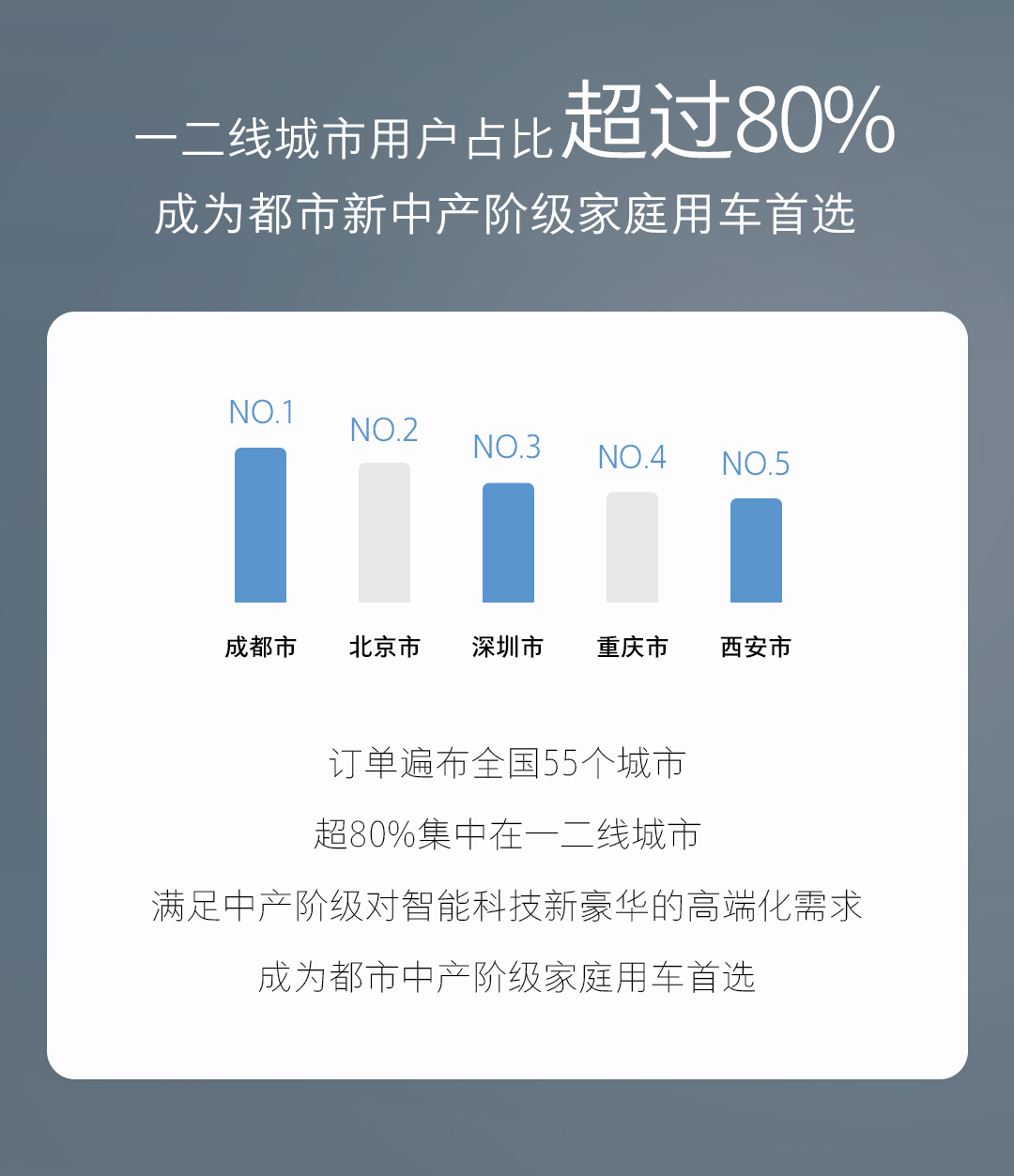 全新藍山的訂單已覆蓋全國55個城市,主要集中在成都、北京、深圳、重慶、西安等一二線城市,不僅彰顯了這些都市精英人群對高端智能出行方式的追求,更體現(xiàn)了其對智能駕駛和奢華配置的高要求。