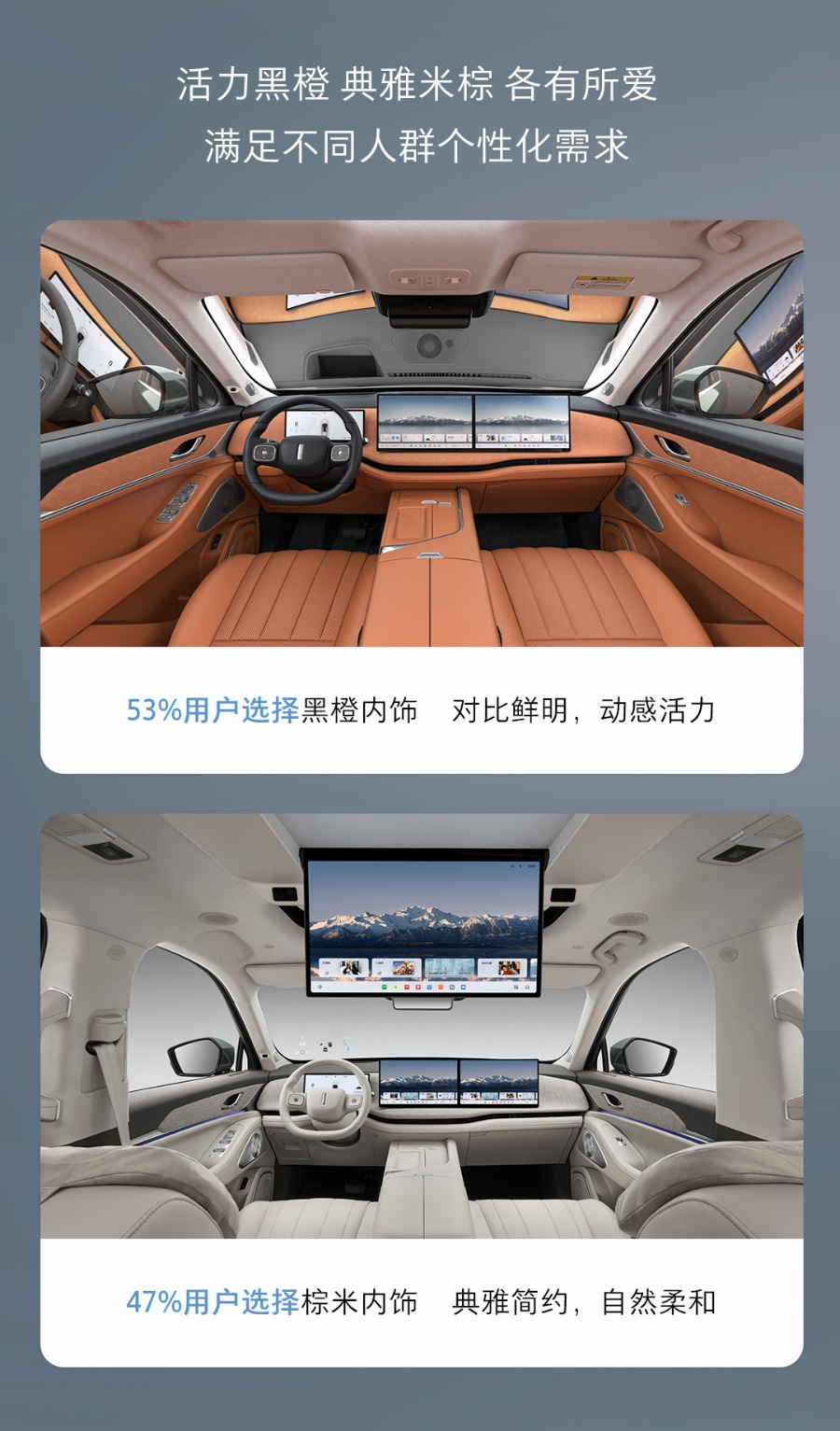 在內(nèi)飾方面,黑橙搭配占比53%,既保留了黑色的神秘感,又融入了橙色的活力元素,整體風格不失優(yōu)雅大氣,又充滿動感與生機,彰顯出對比鮮明、溫暖陽光的空間氛圍;棕米內(nèi)飾則以47%的占比,為車艙營造一抹精致與高雅,高級質(zhì)感,一眼望去平和寧靜,營造出自然柔和的家庭氛圍,同樣符合更多用戶的審美需求。