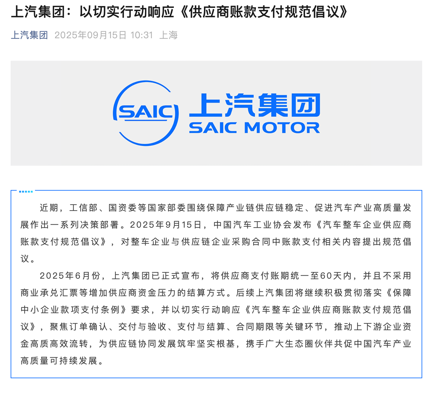央廣網(wǎng)北京9月15日消息(記者董楠)9月15日,中國(guó)汽車工業(yè)協(xié)會(huì)(簡(jiǎn)稱“中汽協(xié)”)發(fā)布《汽車整車企業(yè)供應(yīng)商賬款支付規(guī)范倡議》,提出為了推動(dòng)汽車行業(yè)落實(shí)《保障中小企業(yè)款項(xiàng)支付條例》,支持重點(diǎn)車企高質(zhì)量踐行供應(yīng)商賬期承諾,在充分協(xié)商的基礎(chǔ)上,對(duì)整車企業(yè)與供應(yīng)商企業(yè)采購(gòu)合同中賬款支付相關(guān)內(nèi)容作出規(guī)范倡議,規(guī)范涉及訂單確認(rèn)、交付與驗(yàn)收、支付與結(jié)算、合同期限多個(gè)環(huán)節(jié)。