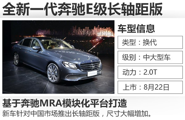 全新一代奔馳E級(jí)長軸距于上個(gè)月在北京奔馳亦莊工廠正式下線,新車針對中國市場的需求進(jìn)行了全面優(yōu)化,從外觀、內(nèi)飾到車身尺寸都有明顯提升。網(wǎng)通社從梅賽德斯-奔馳官方了解到,全新一代奔馳E級(jí)長軸距版將于8月22日在北京正式上市。新車采用不同調(diào)校的2.0T發(fā)動(dòng)機(jī),并首次搭載9速自動(dòng)變速箱。