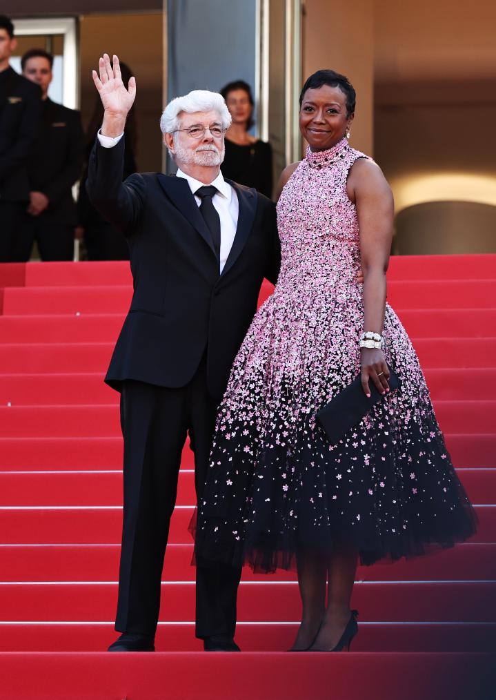 5月25日,在法國(guó)南部城市戛納舉行的第77屆戛納電影節(jié)上,美國(guó)導(dǎo)演、編劇、制片人喬治·盧卡斯(左)抵達(dá)閉幕式紅毯。新華社記者 高靜 攝