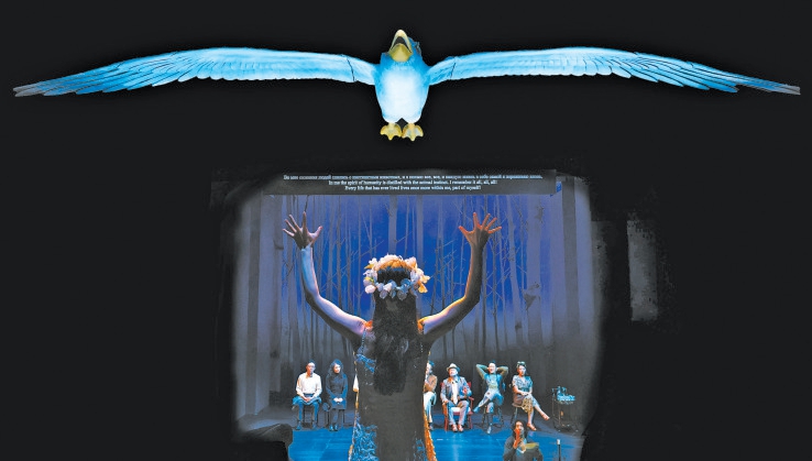 為了實現這一理念,劇組對舞臺進行了大刀闊斧的改造,拆除了部分觀眾席座位,使得舞臺與觀眾席之間形成了一條真實的“路”。一只巨大的海鷗懸掛在觀眾席上方,成為連接現實與戲劇世界的紐帶。這種獨特的舞臺設計,讓每一位走進劇場的觀眾可以看到一個與傳統(tǒng)鏡框舞臺截然不同的開放式空間,它打破了舞臺與觀眾席之間的界限,不僅營造出一種開放而沉浸的觀演環(huán)境,讓演員的表演更加自然流暢,也讓觀眾能夠更加近距離地感受到劇中人物的情感波動和命運變遷。