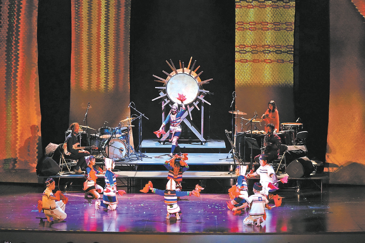 10月12日晚,一場(chǎng)將云南深山原始生命力融合跨越時(shí)空藝術(shù)想象力的演出登上北京舞臺(tái)。作為第二十八屆北京國際音樂節(jié)的重磅演出之一,由普利策音樂獎(jiǎng)得主、華人作曲家杜韻傾力創(chuàng)作,北京國際音樂節(jié)與美國林肯中心聯(lián)合委約的音樂劇場(chǎng)作品《刻在森林的?!吩诒本┫矂≡菏澜缡籽荨碜栽颇衔麟p版納的非遺項(xiàng)目基諾族大鼓舞傳承人何桂英,帶領(lǐng)8位基諾族少年,在舞臺(tái)上敲響大山里特有的聲音。