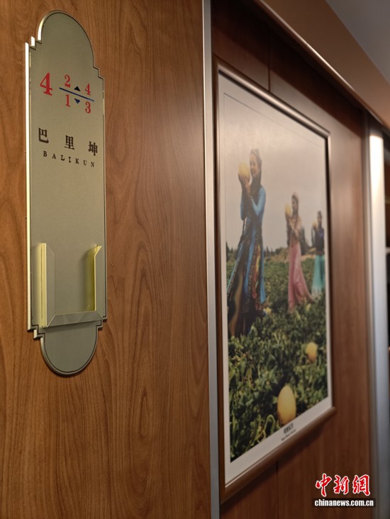 穿行在車廂中間,處處可見新疆的濃濃風(fēng)情。秉持“一車一風(fēng)景”的理念,車廂內(nèi)每個房間均以新疆知名景區(qū)命名,房間門口還張貼著對應(yīng)景點的美食美景海報,讓游客未至景區(qū),先浸風(fēng)情。