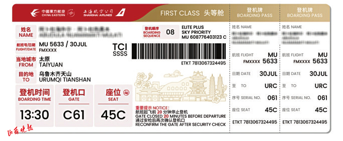 此次升級(jí)不僅注重文化表達(dá),更著力提升服務(wù)體驗(yàn)。登機(jī)牌對(duì)登機(jī)口、起飛時(shí)間、座位號(hào)等關(guān)鍵信息進(jìn)行了“放大提亮”處理,通過字體加粗、色彩對(duì)比等設(shè)計(jì),顯著提升了信息辨識(shí)度,特別方便老年旅客快速獲取信息,有效降低誤機(jī)風(fēng)險(xiǎn),體現(xiàn)了東航精細(xì)化服務(wù)理念。