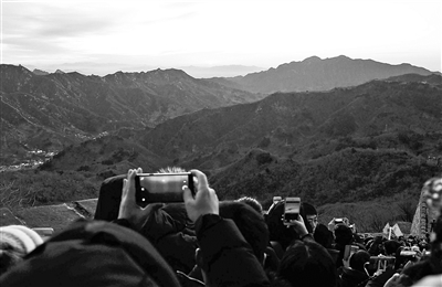 2018年一天,來自各地的數(shù)百游客在早晨6時(shí)許,紛紛登上慕田峪長城,迎接2018年的第一縷曙光,為新的一年祈福。