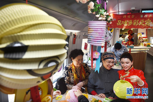 3月1日,在青島開(kāi)往北京南的G184次列車(chē)上,青島高鐵餐飲公司的工作人員和旅客一起制作花燈。 當(dāng)日,中國(guó)鐵路濟(jì)南局集團(tuán)有限公司在部分列車(chē)上開(kāi)展“品味多彩元宵共享幸福旅程”活動(dòng),舉行猜燈謎、品元宵、展茶藝、做花燈等活動(dòng),邀請(qǐng)旅客共同參與。 新華社記者 李紫恒攝 |