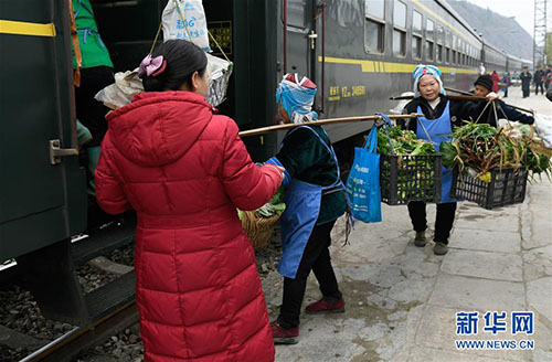 1月27日,乘客挑著擔子登上5639次列車。 由貴州玉屏開往貴陽的5639次列車是輛綠皮“慢火車”。沿途群眾每天挑著籮筐上車,將自家出產(chǎn)的農(nóng)作物帶到貴陽、凱里等地販賣,再坐著火車把生產(chǎn)資料和日用品帶回家。時間一長,不少乘客直接在列車上買賣貨物。春節(jié)將至,蔬菜水果等農(nóng)產(chǎn)品交易較往日更加紅火,列車上的“年貨市場”洋溢著濃濃年味。 新華社發(fā)(許毅 攝)