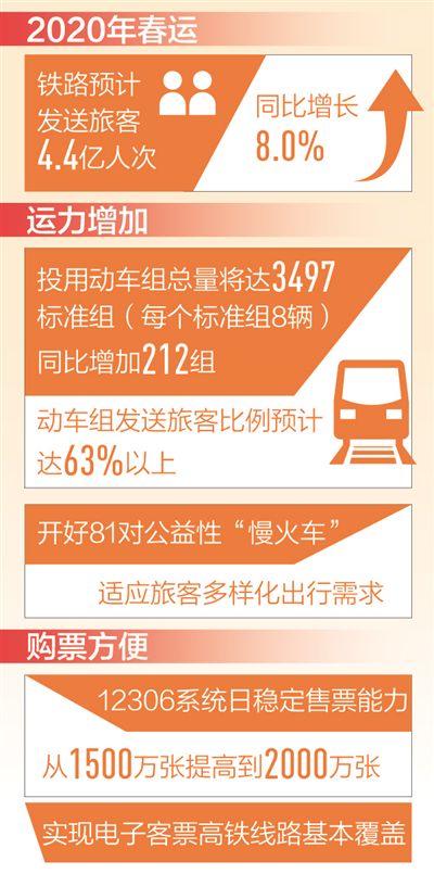 國鐵集團相關(guān)負責人介紹,2020年鐵路春運自1月10日開始,2月18日結(jié)束,共40天,節(jié)前15天,節(jié)后25天。鐵路部門安排節(jié)前每日開行旅客列車5275對,運輸能力達到1010萬人;節(jié)后每日開行旅客列車5410對,運輸能力達到1043萬人。
