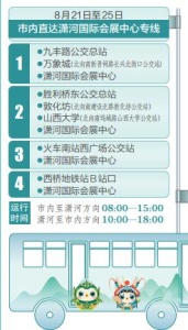 太原市將在山西文博會期間開通5條免費(fèi)公交接駁專線。其中,4條市內(nèi)直達(dá)瀟河國際會展中心的專線,分別從九豐路公交總站—萬象城(北向南新晉祠路長興北街口公交站)—瀟河國際會展中心;勝利橋東公交總站—敦化坊(北向南建設(shè)北路敦化坊公交站)—山西大學(xué)(北向南塢城路山西大學(xué)公交站)—瀟河國際會展中心;火車南站西廣場公交站—瀟河國際會展中心;西橋地鐵站B站口—瀟河國際會展中心。運(yùn)行時(shí)間為市內(nèi)至瀟河方向8:00—15:00,瀟河至市內(nèi)方向10:00—18:00。此外,為便于駕車自行前往的市民出行,還開通了1條社會停車場至山西瀟河國際會展中心的免費(fèi)接駁線路。該線路從先行路瀟河大街口經(jīng)先行路至?xí)怪行耐颠\(yùn)行,在智慧南街口、先行路樂商街口停靠,運(yùn)行時(shí)間為9:00—18:00。