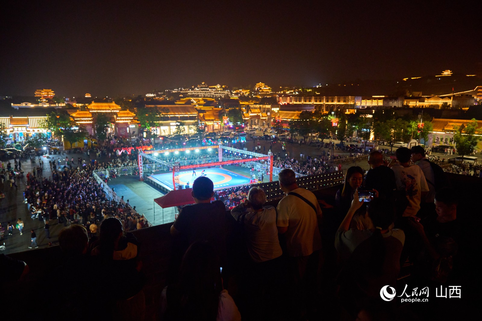 游客們在忻州古城城墻上觀看對抗撓羊賽。人民網 張超寧攝