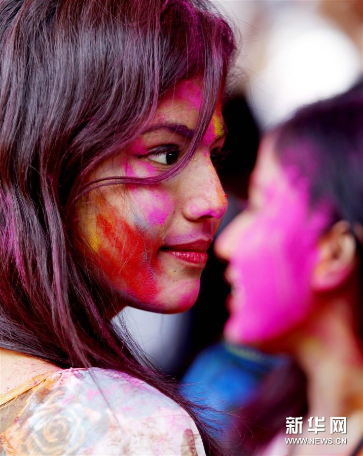 胡里節(jié)也叫“灑紅節(jié)”,人們?cè)谧约耗樕虾蜕砩贤可项伭?,還向別人拋撒五顏六色的顏料和粉末,迎接春天的到來。新華社發(fā)(吳昂 攝)