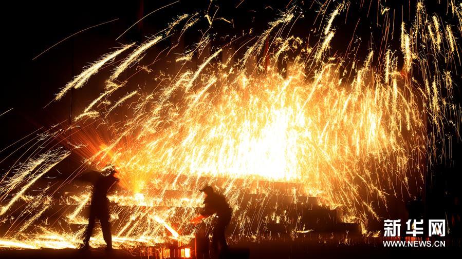 1月12日,河北磁縣開始舉行“打鐵花”慶新年活動。“打鐵花”是以小煉鐵爐將生鐵化成鐵水后,用木板將鐵水加鋸末打上天空,鋸末在空中燃燒形成“鐵花火雨”四濺飛揚的景象。打鐵花”是當?shù)貧v史悠久的民俗娛樂活動。新華社發(fā) (趙鴻宇 攝)