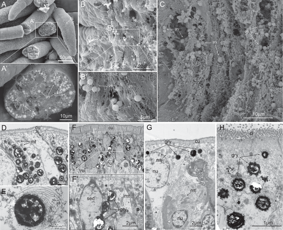 通過(guò)顯微鏡觀察,科學(xué)家發(fā)現(xiàn)蠕蟲的上皮細(xì)胞中充滿了直徑0.77-1.29微米的黃色顆粒。這些顆粒不僅存在于體表,還分布在鰓、口觸手和消化道中——所有與海水直接接觸的部位。