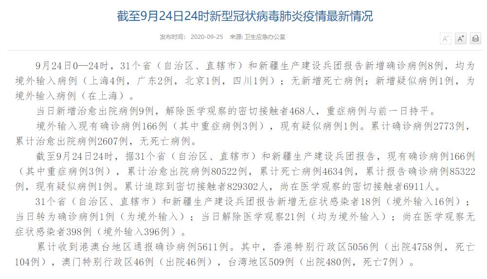 國家衛(wèi)健委:9月24日新增確診病例8例 均為境外輸入病例