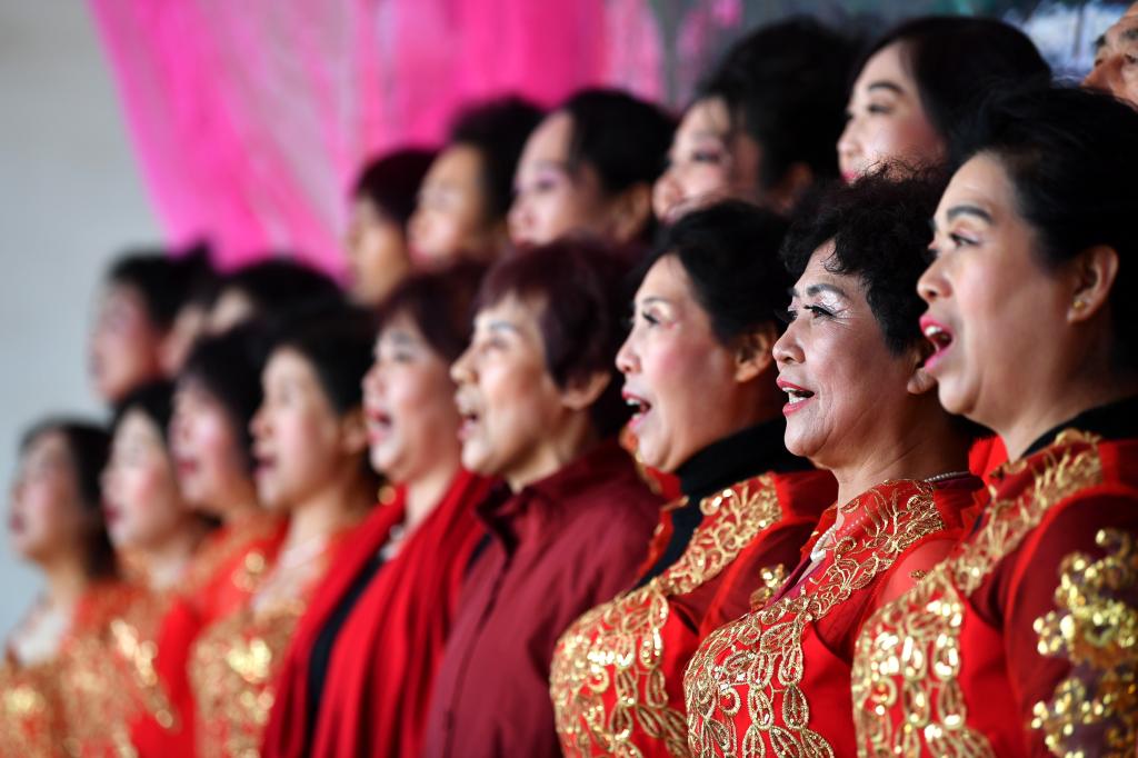↑1月3日,在山西省渾源縣荊莊村,渾源縣貧困山區(qū)合唱團在表演歌舞《看山看水看中國》。