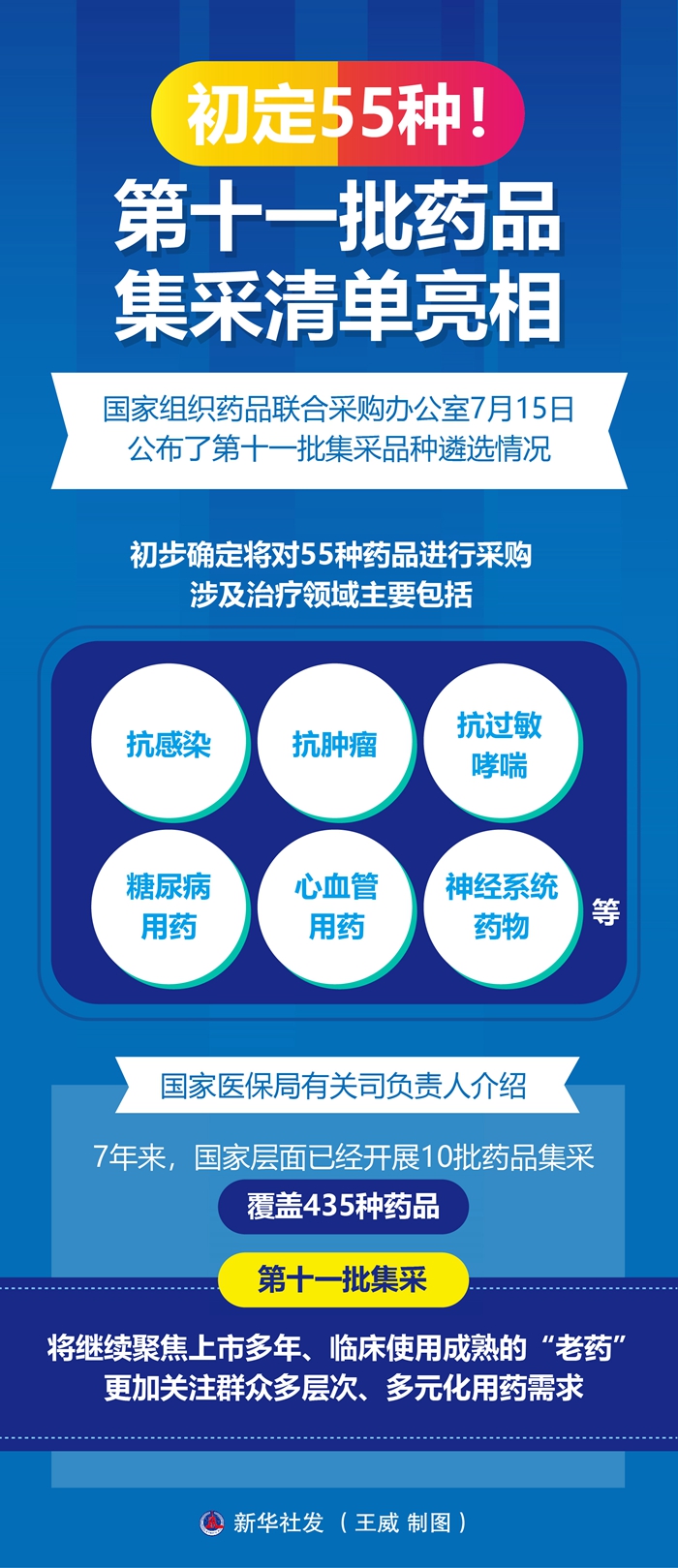 “新藥不集采、集采非新藥。”國(guó)家醫(yī)保局有關(guān)司負(fù)責(zé)人介紹,7年來(lái),國(guó)家層面已經(jīng)開(kāi)展10批藥品集采,覆蓋435種藥品,第十一批集采將繼續(xù)聚焦上市多年、臨床使用成熟的“老藥”,更加關(guān)注群眾多層次、多元化用藥需求。