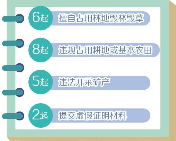 有8起違規(guī)占用耕地或基本農(nóng)田:包括內(nèi)蒙古愷鑫農(nóng)牧業(yè)科技有限公司種植綠化裝飾草皮違規(guī)占用永久基本農(nóng)田459.20畝;上海市金山區(qū)楓涇鎮(zhèn)對(duì)占用破壞69.63畝耕地問題監(jiān)管不力;江蘇省鎮(zhèn)江市句容市天王鎮(zhèn)政府及市相關(guān)部門未如實(shí)上報(bào)種植綠化裝飾草皮違規(guī)占用永久基本農(nóng)田問題;湖北省荊州市綠普綠化工程有限公司種植綠化裝飾草皮違規(guī)占用永久基本農(nóng)田340.49畝;廣東省茂名市高州市深德旅游發(fā)展有限公司侵占耕地47.24畝挖湖造景等。
