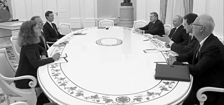 俄羅斯總統(tǒng)普京和美國(guó)特使會(huì)談現(xiàn)場(chǎng)。據(jù)央視新聞