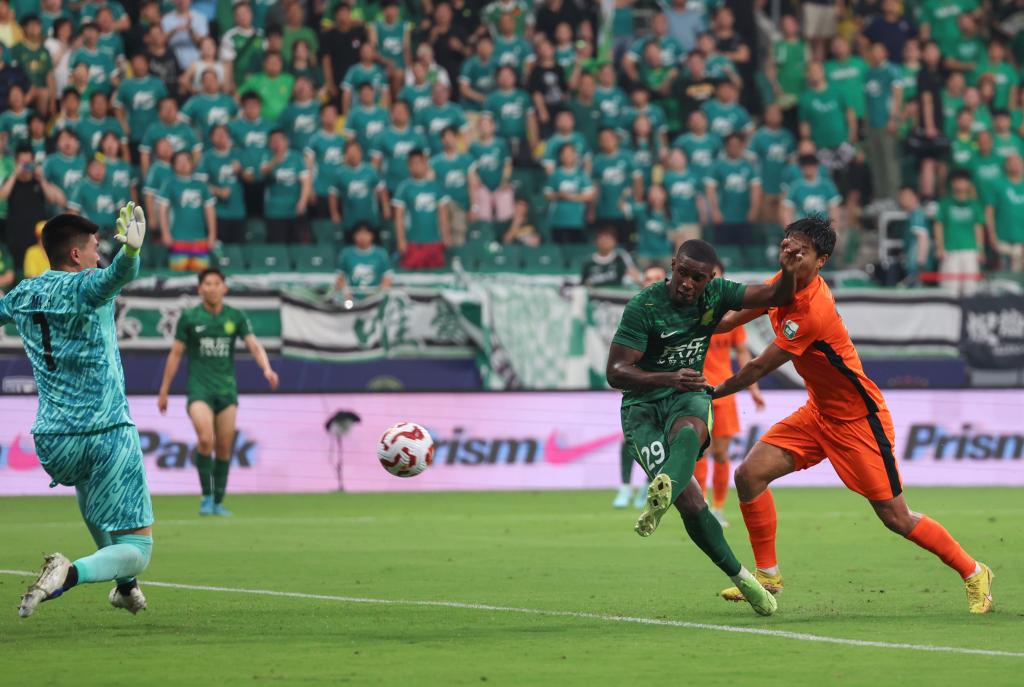 6月30日,北京國安隊球員法比奧(右二)在比賽中射門得分。新華社記者 胡星宇 攝