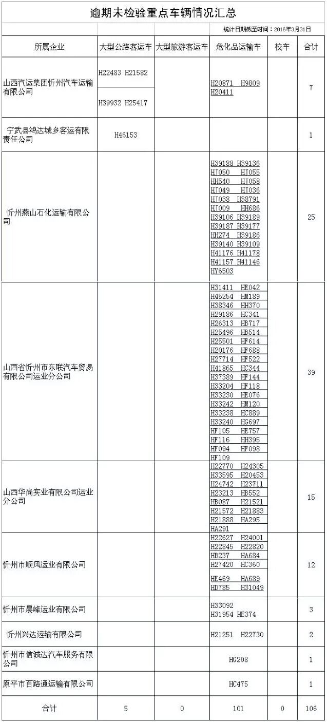 截至2016年3月31日,忻州市大型公路客運(yùn)車、大型旅游客運(yùn)車、危險(xiǎn)貨物運(yùn)輸車、校車逾期未檢驗(yàn)、未報(bào)廢情況通報(bào):