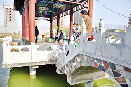 這個(gè)時(shí)候,宋利峰和女友劉丹,帶著姐姐的孩子也恰好走進(jìn)水榭。孩子們?cè)谂d趣方面往往會(huì)有驚人的趨同感,宋利峰的小外甥“眼饞”月月手里的魚(yú)食,在韓建萍的開(kāi)導(dǎo)下月月從袋子里抓了一把魚(yú)食給了這個(gè)陌生的小伙伴。月月仍在水榭西側(cè)的欄桿處向水面撒食,宋利峰的小外甥在石拱橋上模仿月月的動(dòng)作,兩個(gè)孩子之間的斜線距離不足一米。