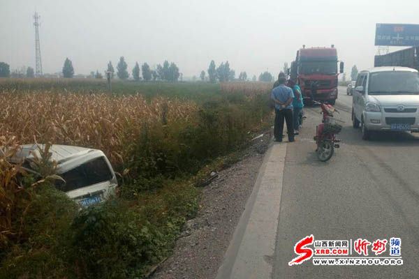 9月16日下午13時左右,在忻州東外環(huán)108國道北肖村段,一輛大貨車發(fā)生追尾,將路邊停放的面包車撞到了溝里,所幸車內(nèi)無人,未造成人員傷亡