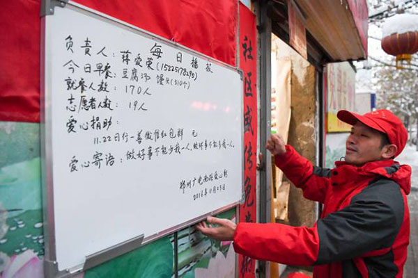 圖說:志愿者在懸掛“每日播報”,將早餐內(nèi)容、就餐人數(shù)等信息公布在愛心粥屋門口(11月23日攝)。圖片來源:新華社
