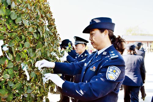 在烈士紀(jì)念碑前,大家重溫了入黨誓詞,許下莊嚴(yán)神圣的諾言,向革命烈士紀(jì)念碑敬獻(xiàn)花圈,集體脫帽低頭默哀,緬懷革命先烈勇于拼搏、甘于奉獻(xiàn)的崇高品質(zhì)。民警們參觀了烈士紀(jì)念碑,了解烈士事跡,并紛紛將胸前的小白花掛到了紀(jì)念碑旁邊的樹上,表示要牢記人民警察的神圣誓言和莊嚴(yán)使命,踐行“忠誠(chéng)、為民、公正、奉獻(xiàn)”的人民警察核心價(jià)值觀,傳承革命烈士的精神和情懷,履行好維護(hù)社會(huì)和諧穩(wěn)定的職責(zé),以飽滿的熱情和昂揚(yáng)的斗志為公安事業(yè)貢獻(xiàn)自己的全部力量。(魯明強(qiáng) 劉慧云)