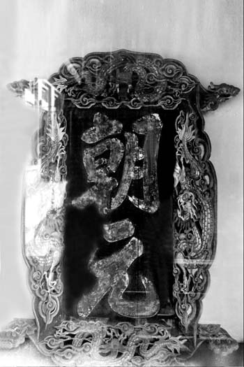 “朝元”金字藍(lán)地浮雕云龍邊大豎匾現(xiàn)存原件