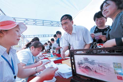 5 月19 日,集郵愛好者在河北省邯鄲市永年區(qū)廣府古城購買《中國古鎮(zhèn)(三)》特種郵票。新華社發(fā)(郝群英攝)