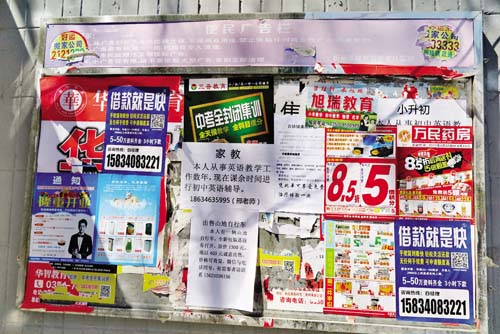 情況一:記者近日在忻州城區(qū)和平街一路口看到,一塊為市民提供告知服務的“便民公告欄”明確提示不允許張貼任何商業(yè)廣告,可是如今上面卻貼滿了商業(yè)廣告,而且張貼得極不整齊,這成為影響市容環(huán)境的一處死角,希望相關(guān)部門及時清理,也希望廣大市民按要求發(fā)布便民信息。