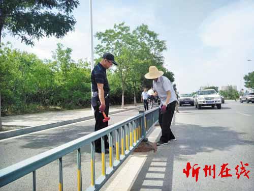 圖為6月5日下午,市交警支隊交通設施大隊正在更換破損護欄底座。