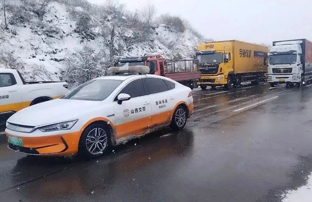 降雪過后,高速路上路面濕滑,山西高速交警和交控集團人員為乘客開道,一路護(hù)送,保障旅客平安回家。