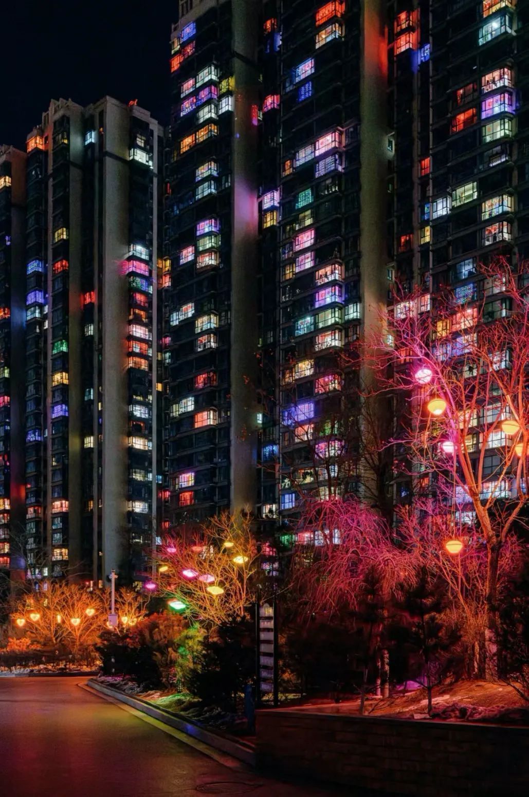 更教人驚嘆的是,大家不約而同在春節(jié)期間的夜里亮起彩燈,成百上千戶在一起頗具規(guī)模,酷炫的彩燈頗具未來感和科技感,給人一種置身未來城市的錯覺。