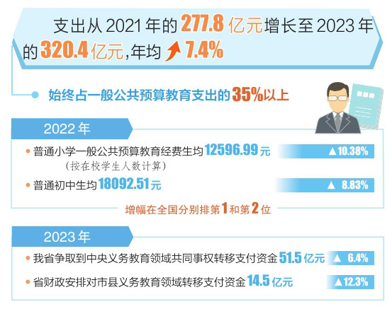 本報訊(記者任志霞)6月13日,記者從省財政廳獲悉,全省義務教育支出從2021年的277.8億元增長至2023年的320.4億元,年均增長7.4%,始終占一般公共預算教育支出的35%以上,義務教育優(yōu)質(zhì)均衡發(fā)展得到切實保障。