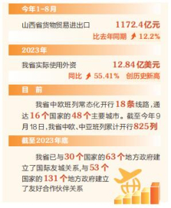 牢記殷殷囑托,奏響開放強(qiáng)音。當(dāng)前,全省上下牢記習(xí)近平總書記殷殷囑托,堅(jiān)定不移推進(jìn)更高水平對外開放,著力優(yōu)化開放布局、推進(jìn)制度型開放、促進(jìn)對外貿(mào)易擴(kuò)量提質(zhì)、提升開放平臺能級、建設(shè)開放通道、提升投資貿(mào)易便利化、加強(qiáng)開放創(chuàng)新能力合作,加快構(gòu)建起多元發(fā)展、多點(diǎn)支撐的全面開放新格局,作為內(nèi)陸省份,山西對外開放的力度越來越大。