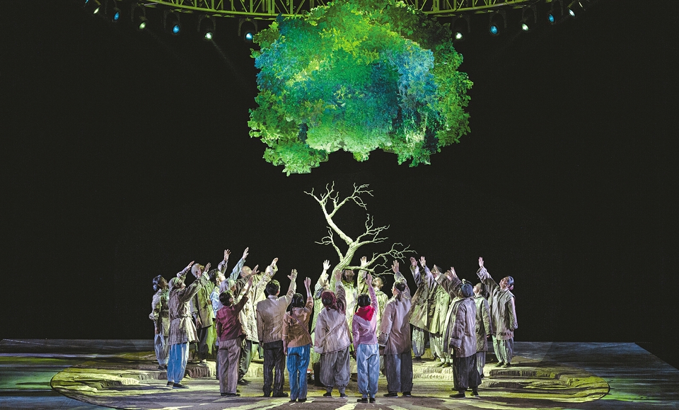 話劇《右玉》講述了上世紀(jì)50年代右玉縣黃沙洼村群眾在縣委書記唐漢元、縣長黎潤杉以及村黨支部書記柱子等黨員干部的帶領(lǐng)下,以頑強(qiáng)的毅力,同“吃人”的風(fēng)沙展開殊死斗爭,把一個(gè)不適宜人類生存的不毛之地,最終變成景色宜人的塞上綠洲的感人至深的故事。該劇在極具風(fēng)格化的視覺美學(xué)中,凸顯了黨和群眾血肉相連、政府和百姓患難與共,共同譜寫了一曲戰(zhàn)天斗地的英雄贊歌。