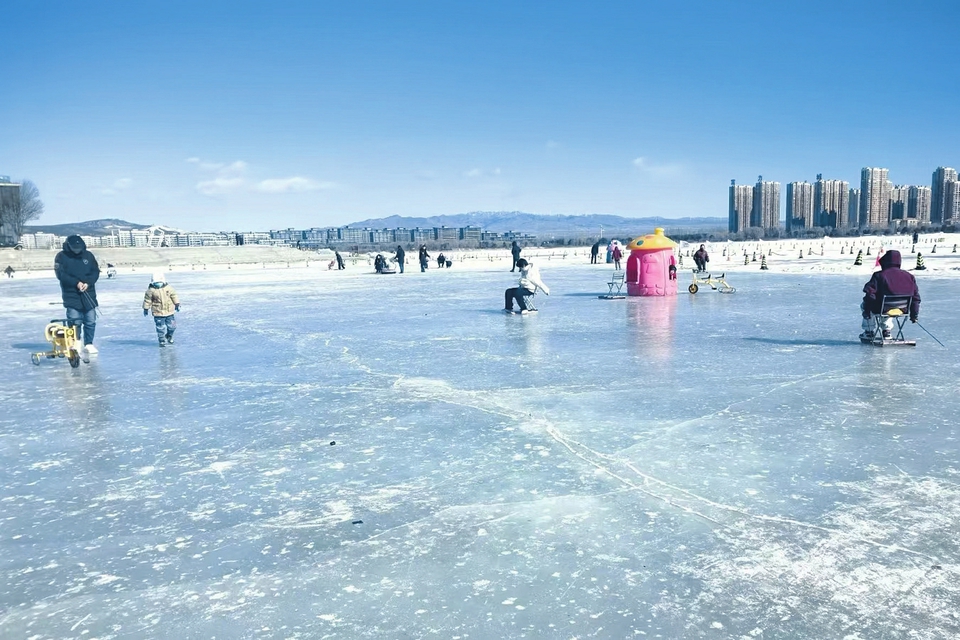 大同文瀛湖生態(tài)公園,市民樂享冰趣。